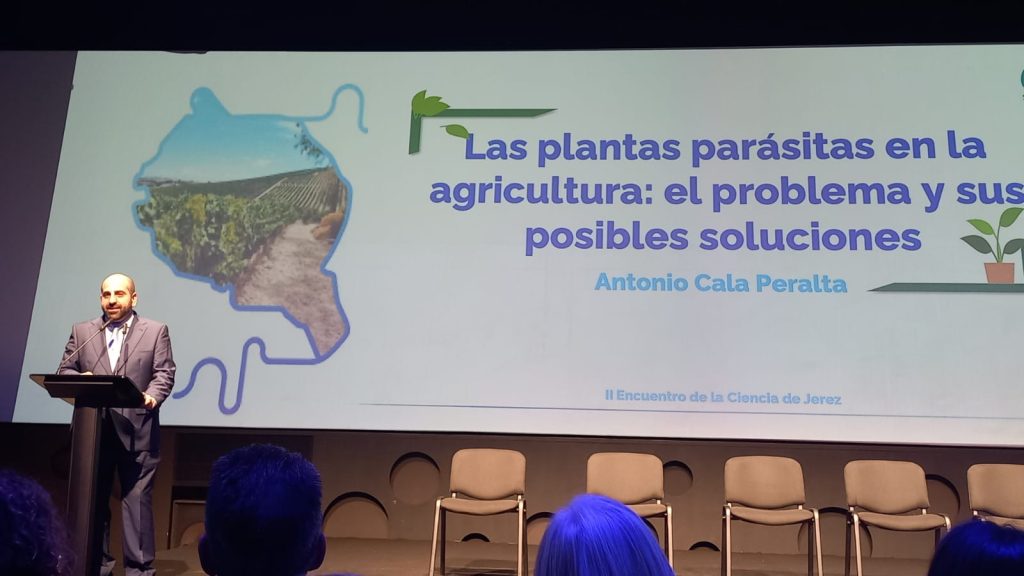 Concretamente, uno de los ponentes en el evento fue nuestro compañero Antonio Cala Peralta, profesor en el Departamento de Química Orgánica de la Universidad de Cádiz y miembro del INBIO. Su investigación se centra en la obtención de compuestos de origen natural para el diseño de nuevos agroquímicos a partir de fuentes vegetales. En esta ocasión, su ponencia se tituló “Las plantas parásitas en la agricultura: el problema y sus posibles soluciones”.